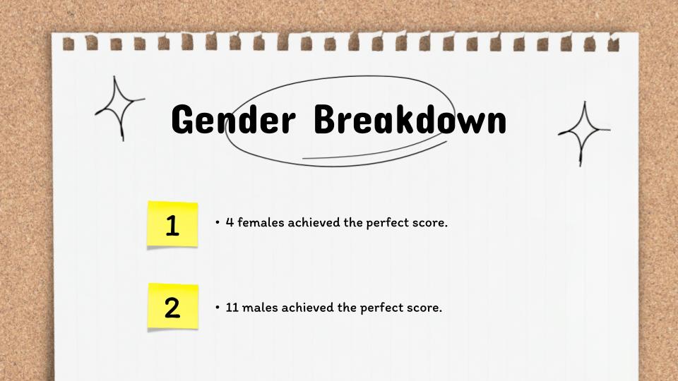 - 15 students attained the perfect ATAR of 99.95, including 11 males and 4 females.